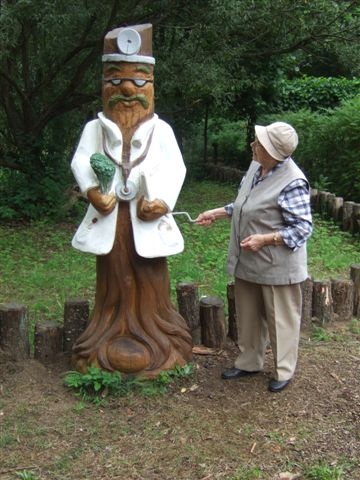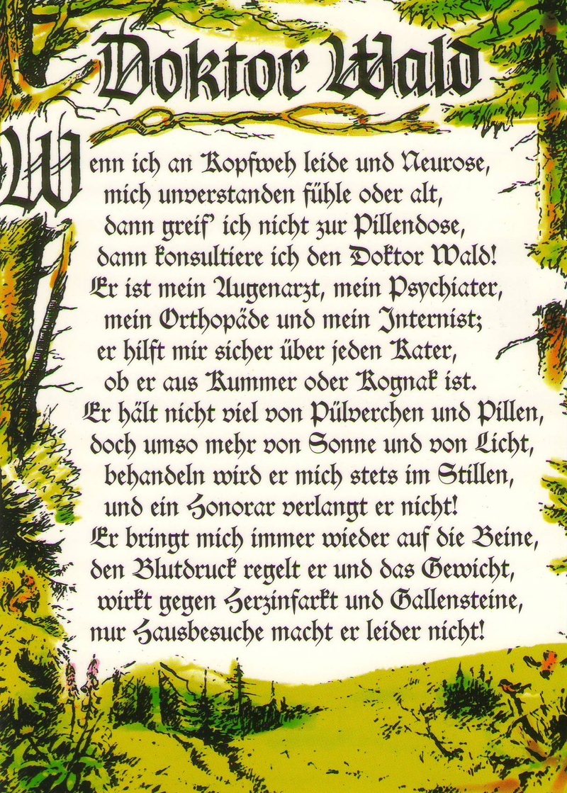 Abhören des Herzens oder der Lunge benötigen. An der linken Hüfte der „Begrüßungs-Figur“ befindet sich eine Kurbel. Wenn man daran (schnell) dreht, spricht sie mit sonorer Stimme und leicht bayerisch klingendem Akzent das schöne vierstrophige, aus der Feder des süddeutschen Forstmanns Helmut Dagenbach stammende Gedicht (Foto) vom „Doktor Wald. Ich habe es, seit der fürchterlichen gewaltsamen Vertreibung aus meiner Heimat im Juli 1945 gesundheitlich angeschlagen, bei Ausflügen in die „grüne Lunge“ über viele Jahre an mir selbst erlebt: Wald hilft und heilt! Wenn